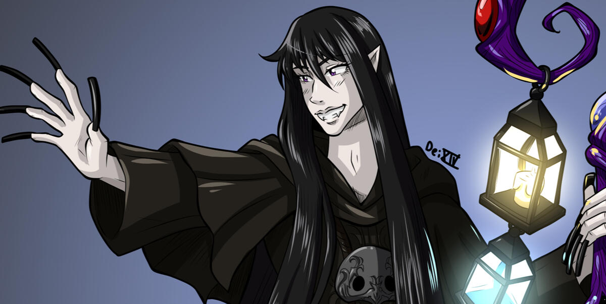 Notable Physical Traits: His most notable physical trait is his hair; pitch black and so long it reaches his knees. He also performed minor body modifications on himself; giving himself pointed ears and long canine teeth.Usual Mood/Expression: Charon always seems to be in a good mood. He's almost never seen without a smile on his face.
